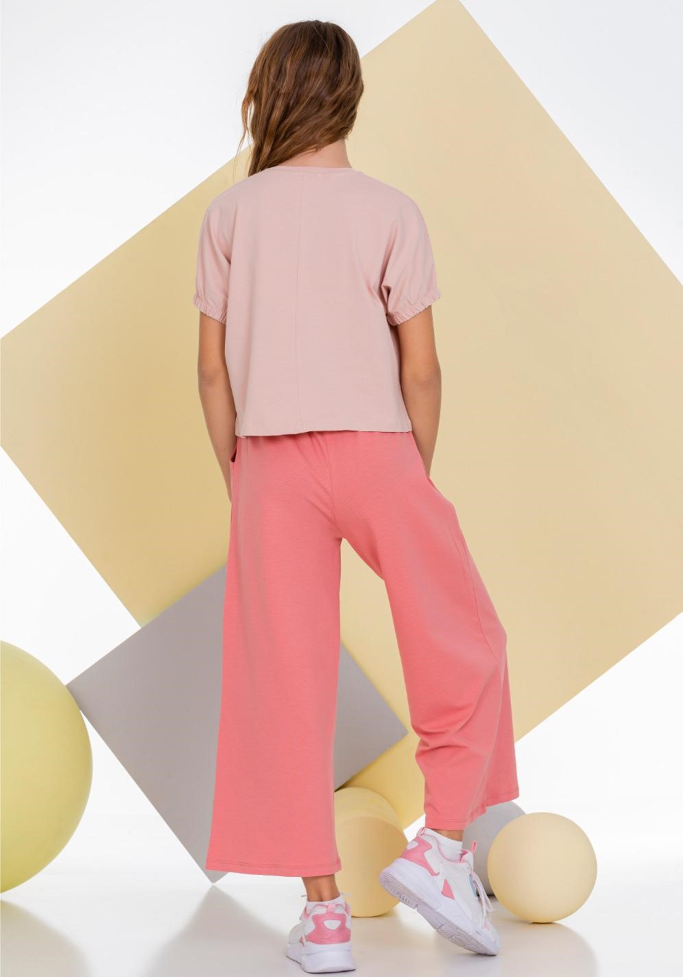 Стильный костюм Smile для девочки оптом. Укороченная футболка свободного кроя оформлена принтом. Рукава присборены резинкой. Широкие брюки с боковыми карманами и защипами на поясе создают модный образ. Костюм Smile для девочки оптом, выполнен из трикотажа кулирка.