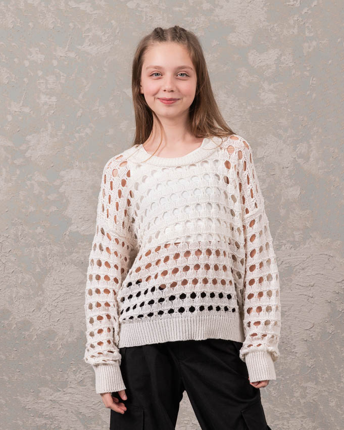 Джемпер DMB для девочек ажурной вязки оптом, выполнен  из 100% хлопка. Свободный крой, круглый вырез горловины.  Модель отлично сочетается с любой одеждой. Под низ можно надеть удлиненный или короткий топ в тон джемперу.
