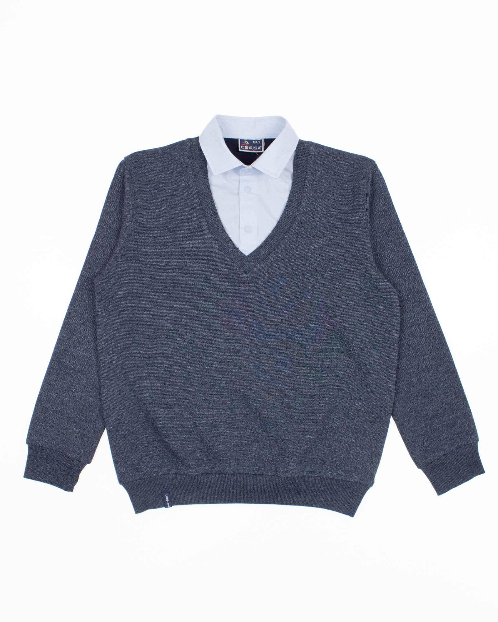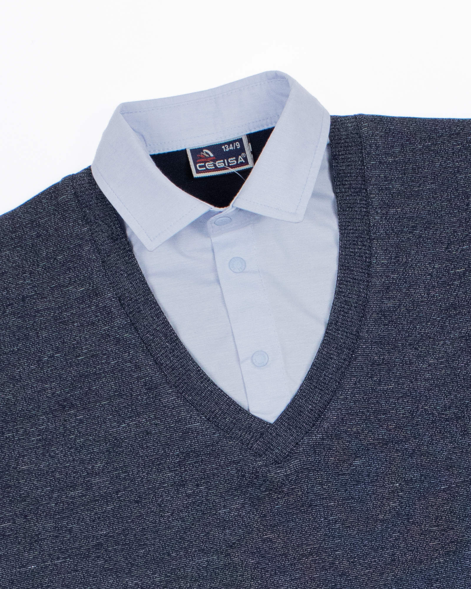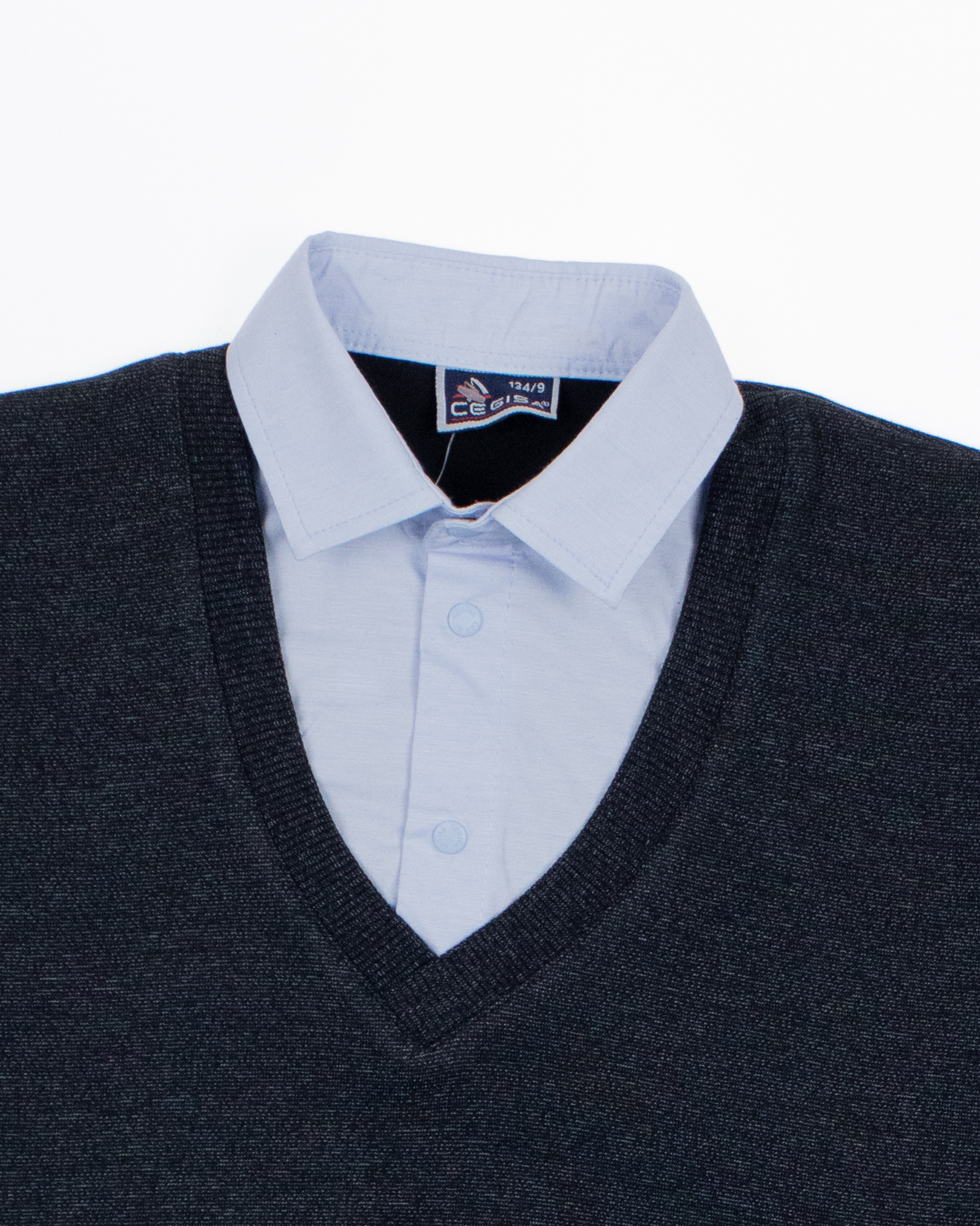 Школьный джемпер-обманка для мальчика оптом с имитацией рубашки выполнен из качественного хлопкового трикотажа с небольшим добавлением лайкры. Ворот сшит из рубашечной хлопковой ткани, застежка-кнопки. Джемпер-обманка выглядит как полноценный комплект рубашки и джемпера. Мальчик будет всегда опрятен в школе, сохраняя при этом официальный дресс-код. Качество наших изделий подтверждают многократные стирки в стиральной машине, при которых жилет-обманка сохраняет прежний вид, без деформации и окрашивания рукавов или ворота. Торговая марка CEGISA представляет большой ассортимент качественной, красивой, классической школьной и спортивной одежды турецкого производства для детей и подростков.