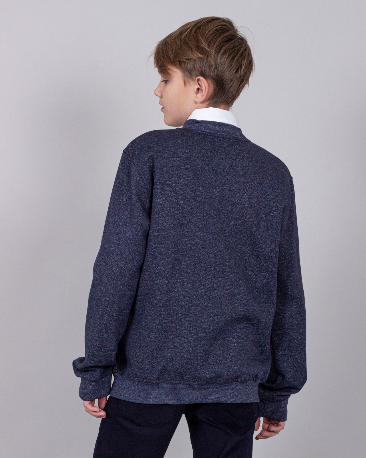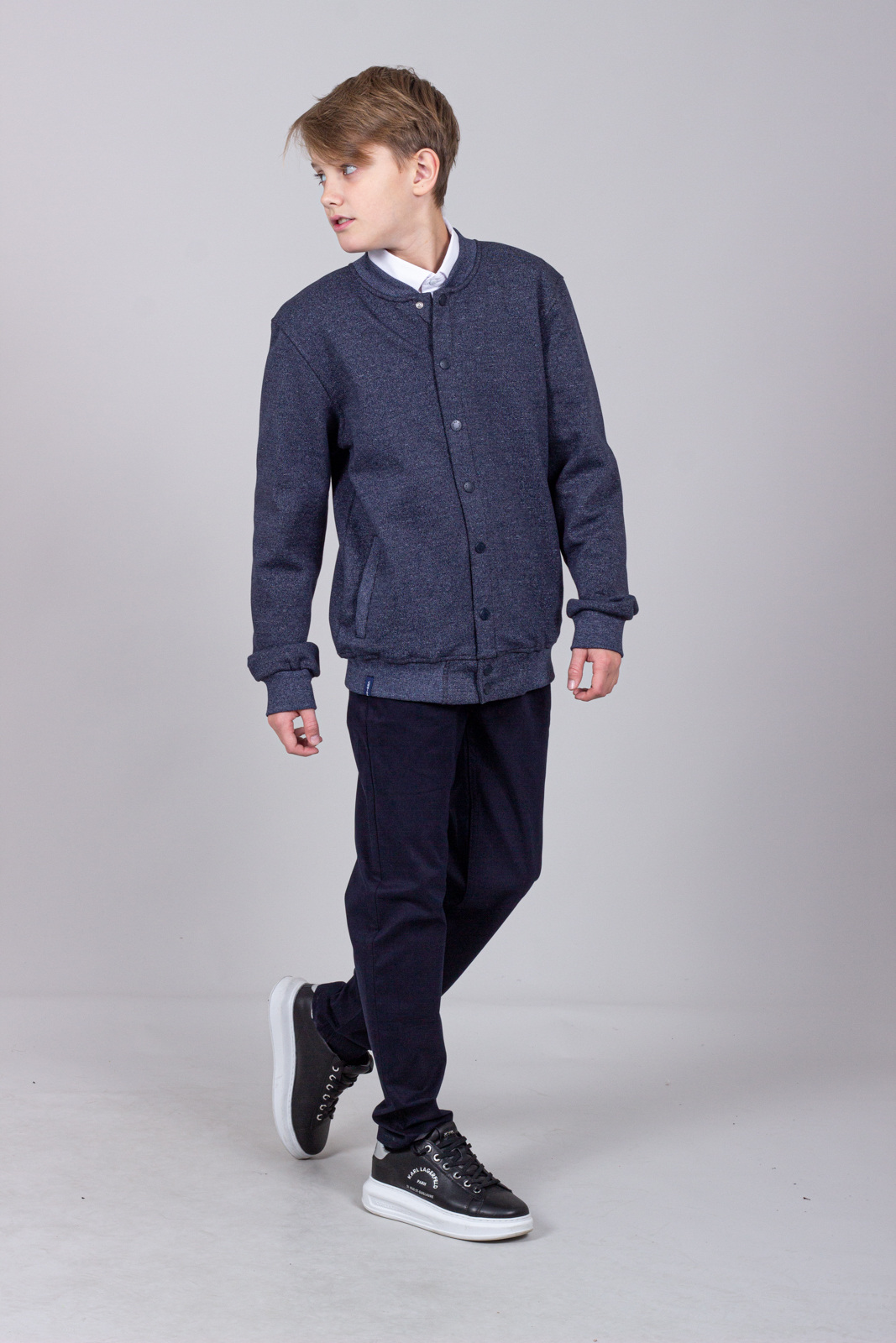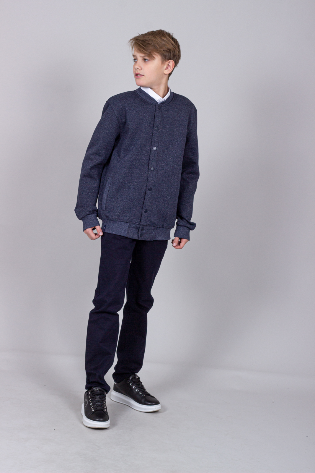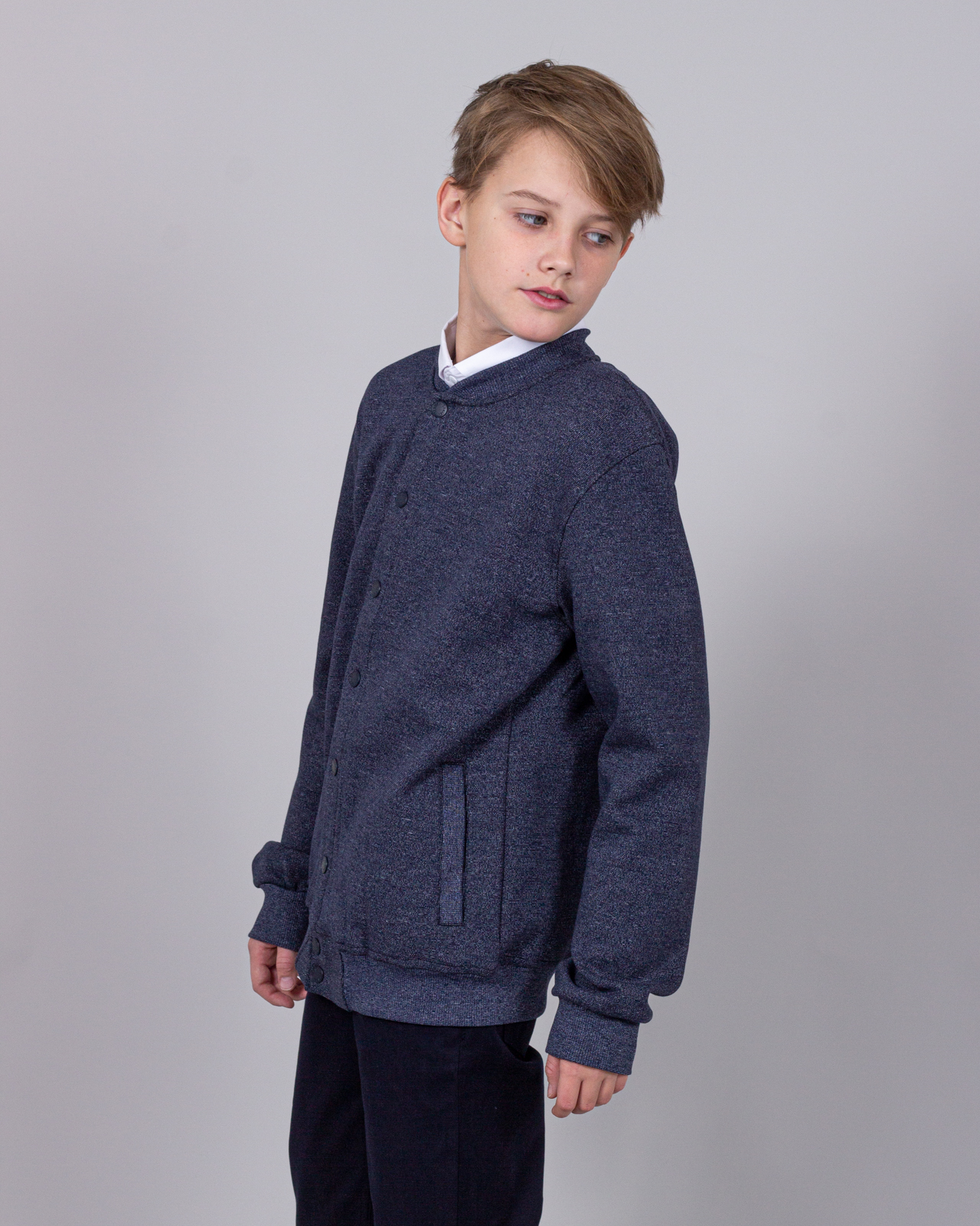 Трикотажный бомбер для мальчика. Выполнен из смесовой ткани, в составе которой натуральный хлопок с добавлением полиэстера. Воротник стойка. Низ изделия и рукава на трикотажном манжете. Вместительные карманы и разъемная застежка - кнопки. Хорошо сохраняет цвет и форму при длительной носке и после многократных стирок. Прекрасно будет смотреться как школьная форма.