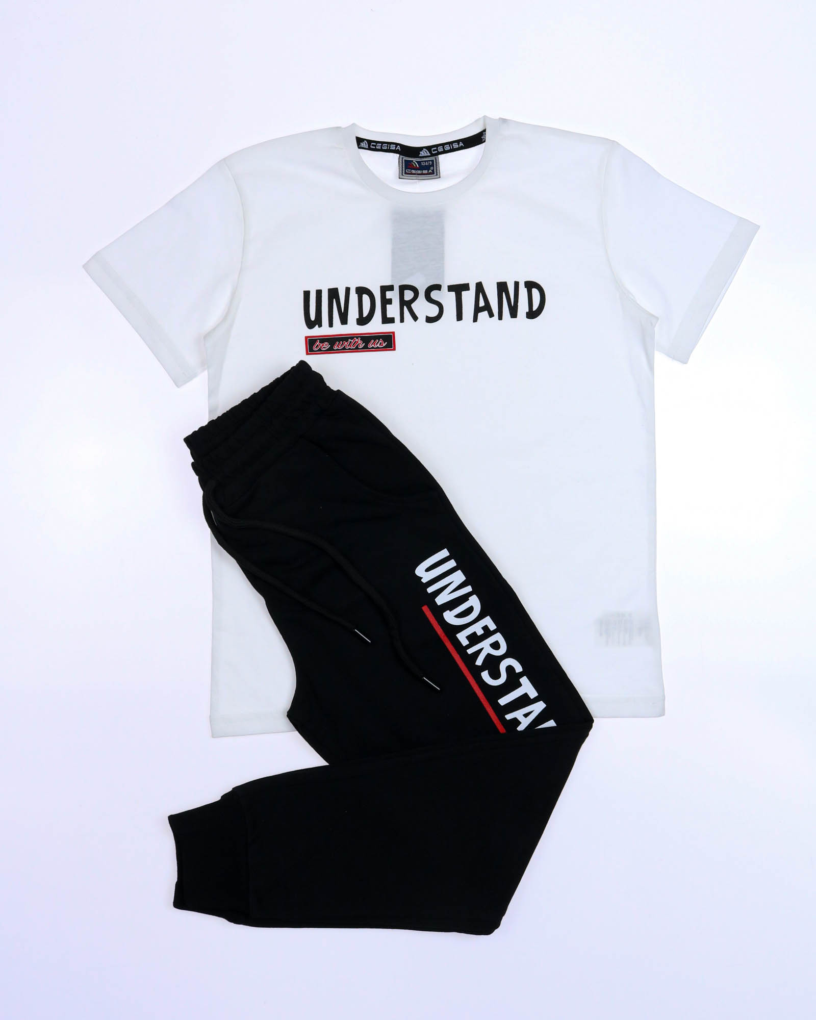 Трикотажный костюм CEGISA из хлопка оптом. Брюки выполнены из футера 2х нитки (петля) с карманами, на эластичном поясе с регулируемым шнурком и оригинальным принтом. Футболка выполнена из кулирной глади,прямого кроя с округлой горловиной, на груди стильный принт.