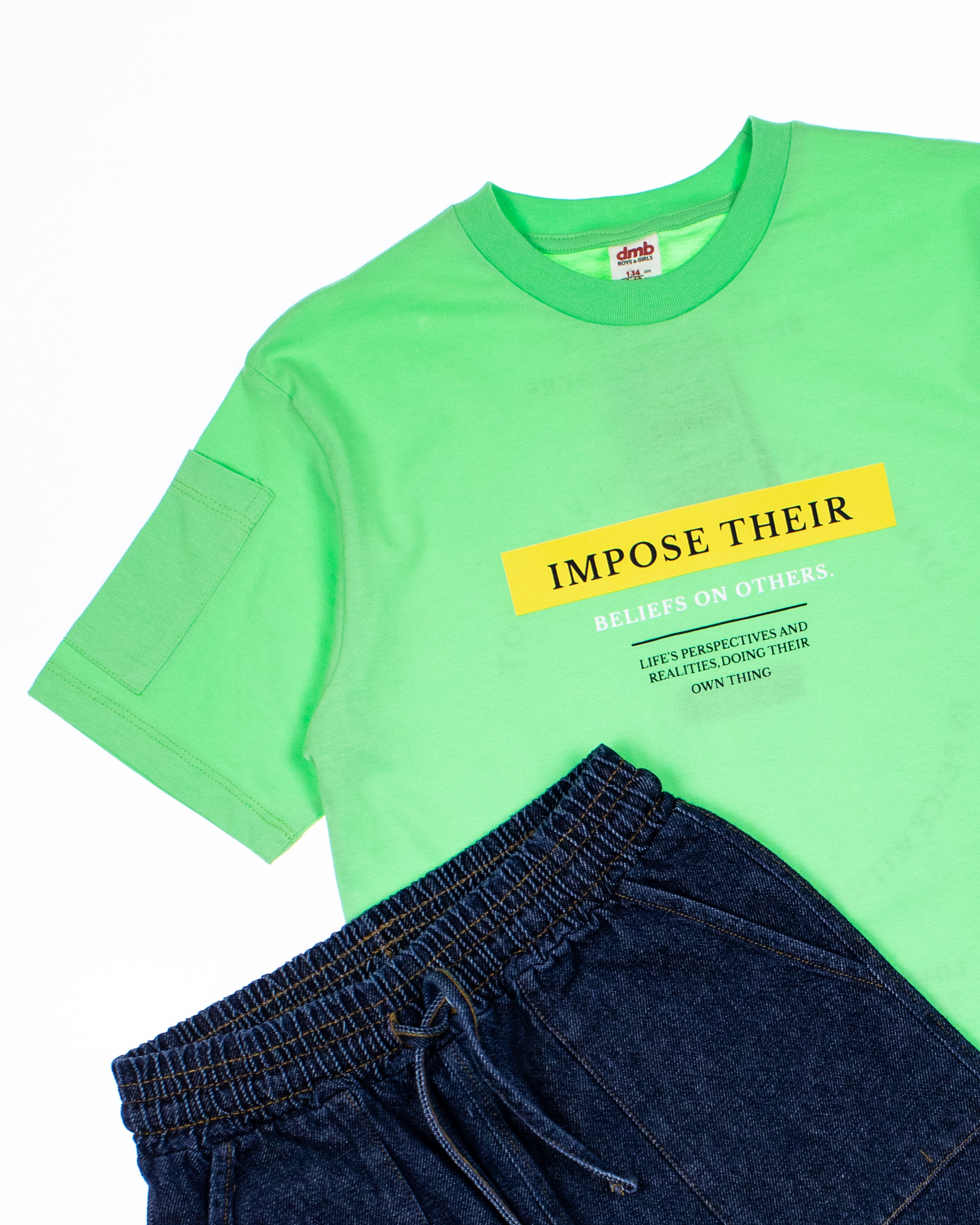 Летний костюм для мальчика Dmb оптом. Футболка прямого кроя с короткими рукавами и  округлой горловиной. Бриджи из облегченной джинсы без эластана с боковыми  карманами. Пояс на резинке с функциональным шнурком позволяет ругулировать объем на талии.